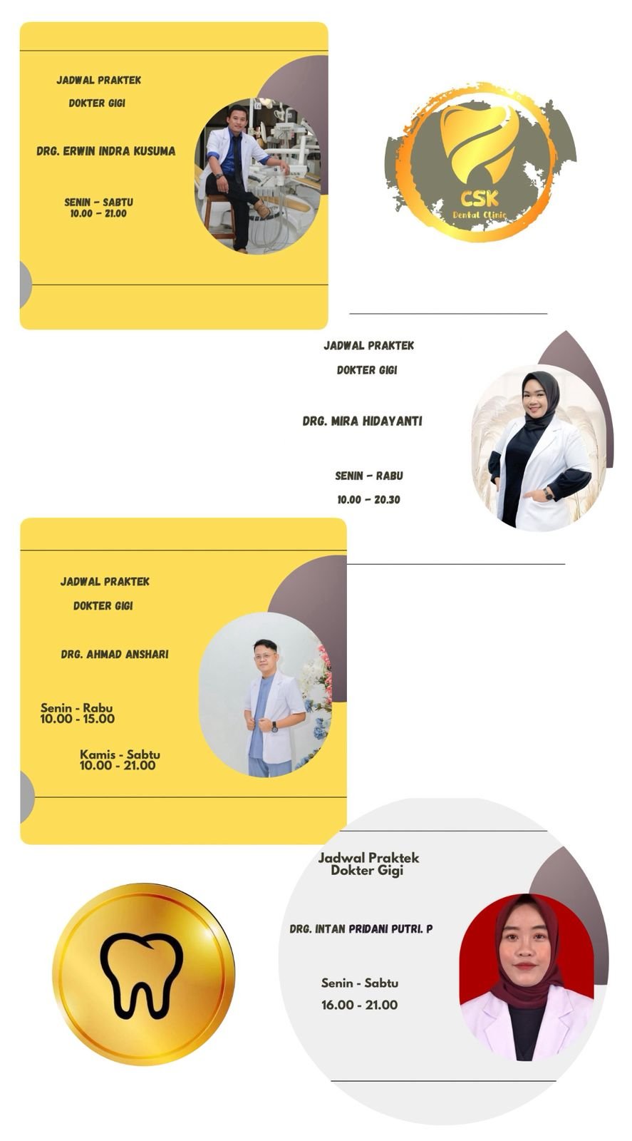 CSK Dental Clinic adalah klinik gigi profesional dengan pengalaman kurang lebih 9 tahun, berkomitmen memberikan pelayanan kesehatan gigi terbaik dan kami menghadirkan suasana nyaman, aman, dan ramah anak sehingga setiap kunjungan menjadi pengalaman positif bagi pasien dari segala usia dan didukung oleh tim dokter gigi yang berpengalaman dan tenaga asisten terlatih.